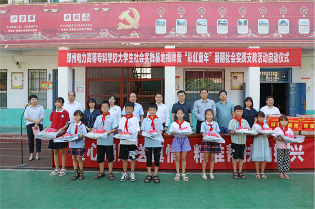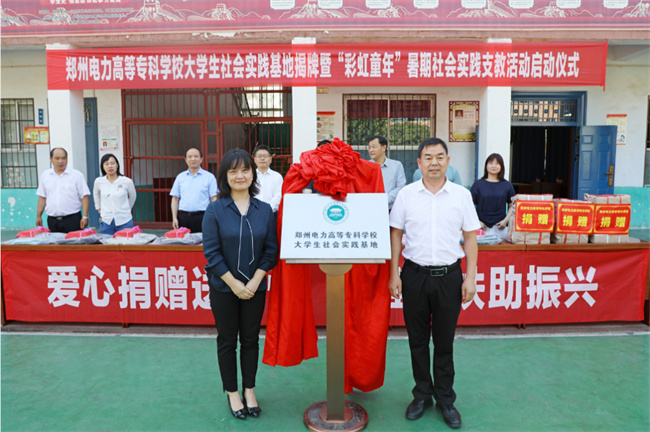 会后,葛寨小学校长位莹刚和学校高级管理师周明霞共同为郑州电力高等专科学校大学生社会实践基地揭牌;与会领导参加“彩虹童年”暑期社会实践支教活动启动仪式并向葛寨小学学生捐赠图书及学习用品。