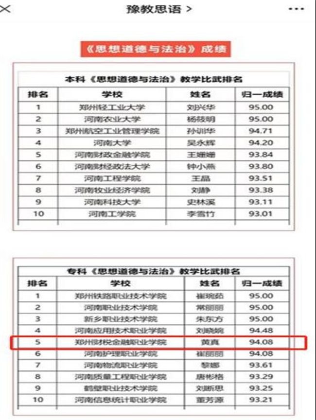 在中共河南省委宣传部、中共河南省委教育工委、河南省教育厅主办的2022年度全省高校思想政治理论课教学技能“大比武”活动中,郑州财税金融职业学院思政部黄真老师荣获全省高职高专《思想道德与法治》教学比武排名第五名的好成绩,将代表该院参加全省思想政治理论课教学大展示活动。