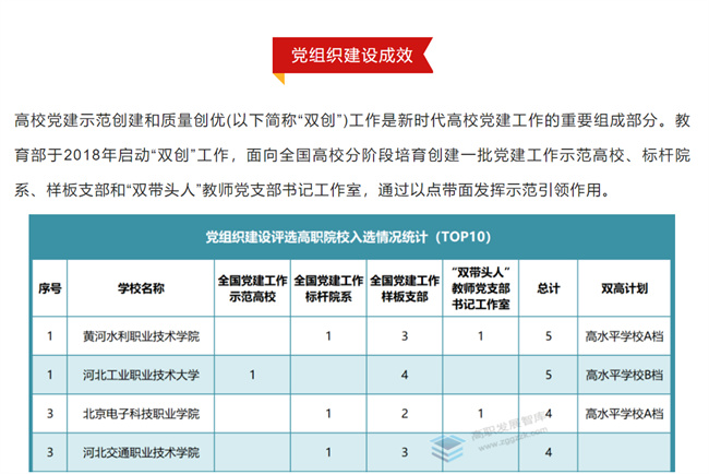 近日,高职发展智库对“双高”建设以来各高职院校党建工作成效进行了评选,黄河水利职业技术学院在党组织建设成效方面表现突出,以入选全国党建工作标杆院系1个、全国党建工作样板支部3个、“双带头人”教师党支部书记工作室1个的优异成绩,排名位列全国高职院校首位。
