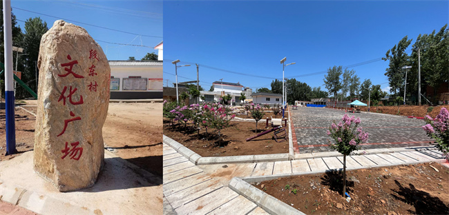 文化广场的建成并非一蹴而就的,而是发扬“钉钉子”精神,一步一个脚印干出来的。为了保证工程质量,学校驻村工作队在工程关键节点时,不论天气如何,坚持到场监督;为了节省资金,文化广场绿化苗木运到村里后,驻村工作队和村两委组织村中党员一起栽种树木,连中午吃饭都在工地不肯离开;由于天气干旱,为了保证树苗的存活,驻村工作队每两天给树苗浇一次水,经常忙到半夜才结束;为了美化党建文化广场,驻村工作队跑遍周边乡镇寻找合适的景观石,在景观石运到村中后,工作队和村两委亲自上阵,帮助搬运石头。不积跬步无以至千里,正是在驻村工作队、村两委和广大人民群众的团结努力下,一步一个脚印,才使段东村文化广场从无到有,从有到美。段东村文化广场的落成,是该校定点帮扶工作中的亮点之一,解决了段东村群众文化、健身、娱乐生活匮乏的实际问题,村民群众在农闲时,“娱乐有去处、健身有场所”,为丰富群众性事业提供了平台,助力乡村振兴的快速推进。