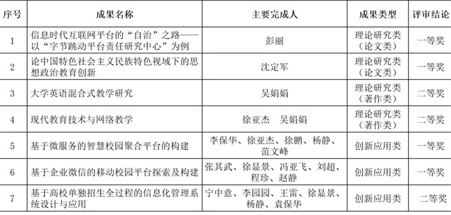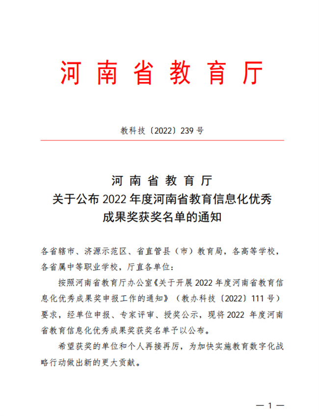 近日,河南省教育厅下发了《河南省教育厅关于公布2022年度河南省教育信息化优秀成果奖获奖名单的通知》(教科技〔2022〕239号)文件,公布了2022年度河南省教育信息化优秀成果奖获奖名单。郑州升达经贸管理学院7项成果获奖,其中理论研究类成果一等奖2项,二等奖2项;创新应用类成果一等奖2项、二等奖1项。