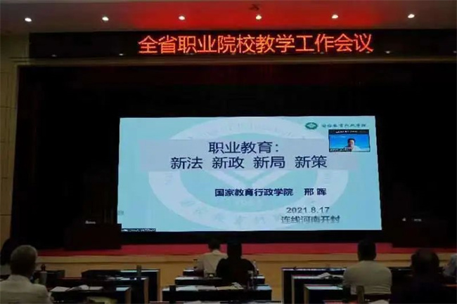 8月17日上午,河南省职业院校教学工作会议在黄河水利职业技术学院召开。会议旨在全面落实全国、全省职业教育大会精神和新职教法要求,系统总结我省职业教育教学工作成就,分析新时期职业院校教学工作面临的新形势、新任务,围绕实施创新驱动、科教兴省、人才强省战略,高质量推进“人人持证、技能河南”建设,安排部署今后一个时期全省职业院校教学工作。省教育厅党组成员、副厅长陈垠亭,开封市人民政府副秘书长王亚文,省教育厅职业教育与成人教育处处长秦剑臣,黄河水利职业技术学院党委书记周保平,校长胡昊出席会议。副校长焦爱萍及各高职院校相关负责人,各省辖市、济源示范区、省直管县(市)教育局相关领导,省属中职学校主要负责人以及具有职业教育培养任务的本科学校部门负责人300余人参加会议。会议由秦剑臣主持。大会与全省高职学校主要领导干部研讨班同步举行,全省高职学校书记、校长通过视频连线方式在焦裕禄干部学院参加本次会议。