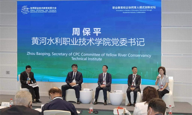 论坛上,周保平向与会国内外职业教育专家学者、企业代表、媒体做了“连接黄河与赞比西河的人才培养驿站——校企协同培养水利国际化技能人才模式探索与实践”的海外创办大禹学院经验分享。
