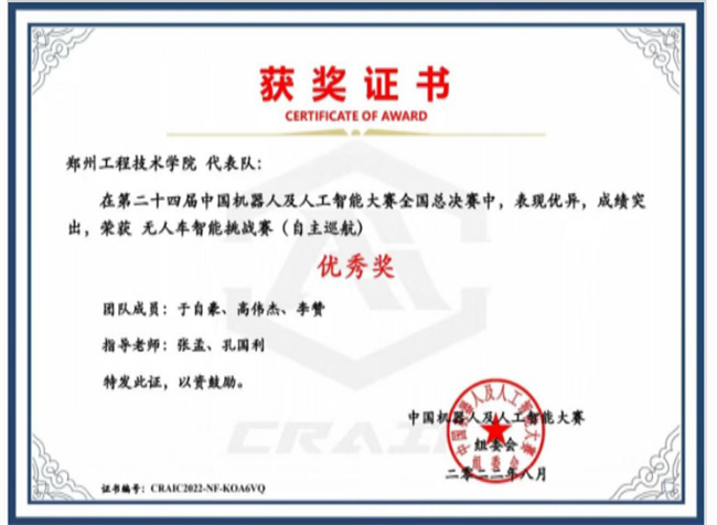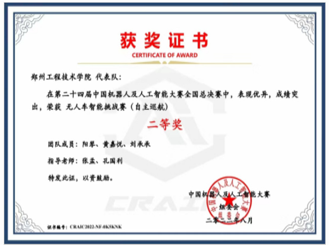 近日,第二十四届中国机器人及人工智能大赛全国总决赛获奖名单出炉,郑州工程技术学信息工程学院物联网工程系师生再获佳绩,物联网工程系学生阳琴、黄嘉悦、刘承承获无人车智能挑战赛国家二等奖,于自豪、高伟杰、李赞、赵曦、黄莹、袁奕凡等同学获无人车智能挑战赛优秀奖。