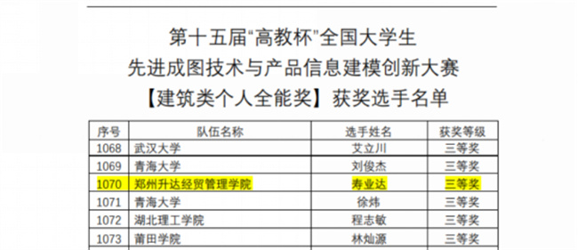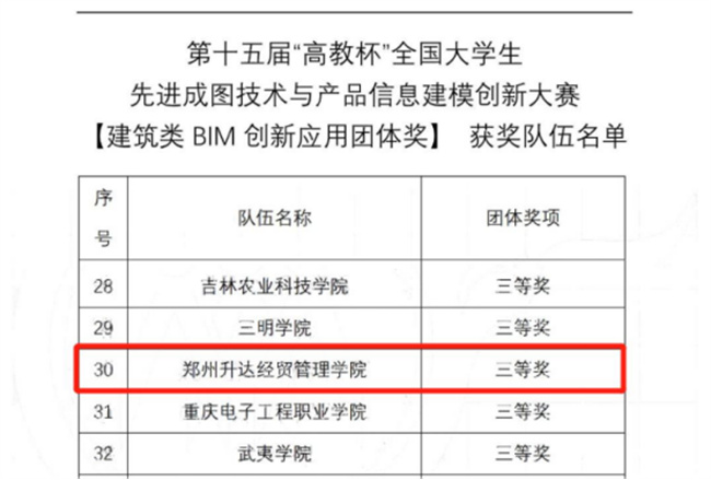 郑州升达经贸管理学院建工学院代表队在第十五届“高教杯”全国大学生先进成图技术与产品信息建模创新大赛全国总决赛中六人居家参赛,其中张宗跃、付向荣、寿业达、陈磊、秦海萍荣获建筑类团体三等奖;张宗跃荣获个人全能二等奖,付向荣、 寿业达、陈磊、秦海萍荣获个人全能三等奖。 BIM创新应用类张宗跃、付向荣、王亚帅、陈磊、秦海萍获得建筑类团队三等奖。