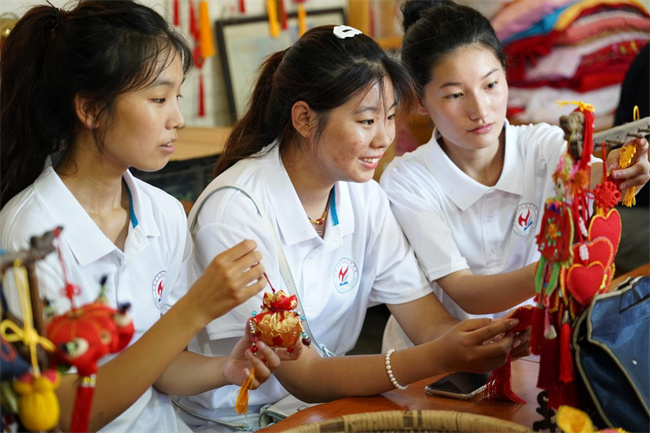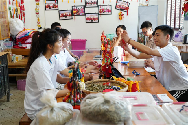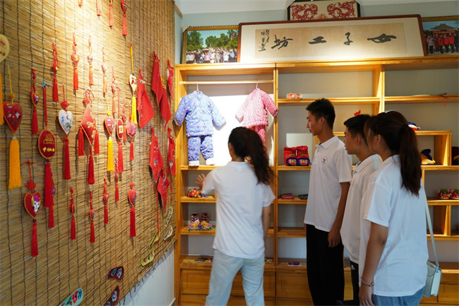图为实践团成员在女子工坊了解学习中草药香包、虎头鞋、剪纸等乡村传统民间非遗技艺项目和产品。王宛玲 摄