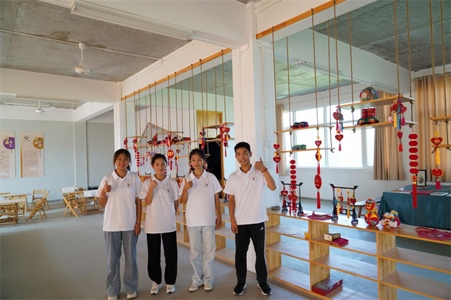 图为实践团成员在非遗体验馆非遗产品展厅前合影,非遗展厅设有研学活动区区,实践团成员把这里作为非遗文化研学基地,常态化开展非遗研学活动。王宛玲 摄