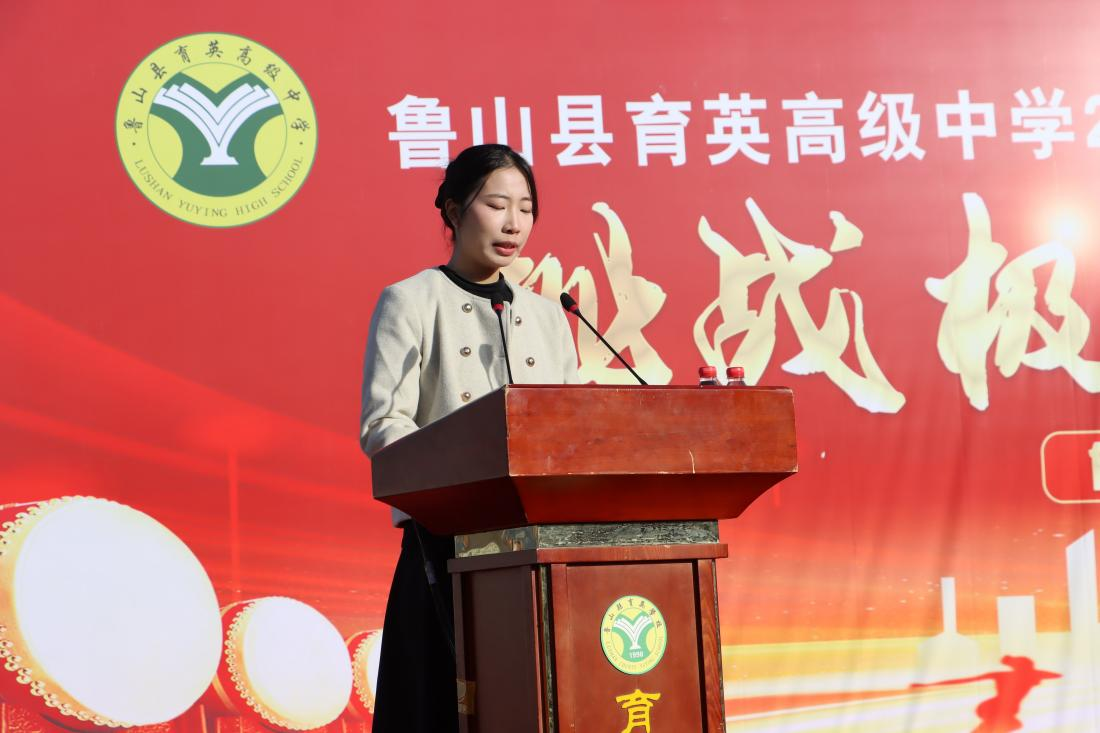 学生代表上台发言,表达了全体同学面对高考的坚定信念和青春誓言。他们心中有火,眼中有光,展现出了育英学子的蓬勃朝气和拼搏精神。 会上播放了学长学姐们的寄语,这些已经从育英校园走向理想大学的学子们,为学弟学妹们送来了祝福与经验,成为同学们前行路上的灯塔。 随后,学校领导在讲话中对全体2026届学子提出三点希望:一是要有“志存高远”的格局,将个人梦想与国家发展、民族复兴相结合,以强烈的责任感驱动前行;二是要有“脚踏实地”的作风,珍惜每一分每一秒,把目标分解到日常,夯实基础、补齐短板;三是要有“迎难而上”的勇气,以乐观心态面对挫折与困难,把挑战当作成长的阶梯,永不言弃、永不退缩。