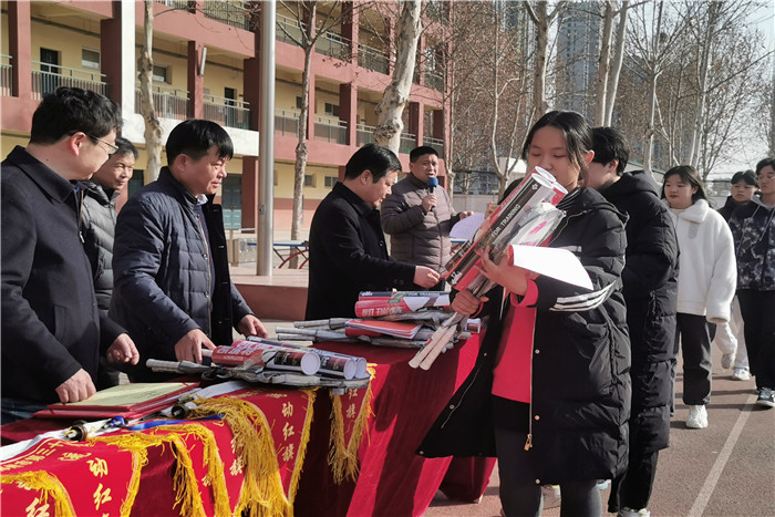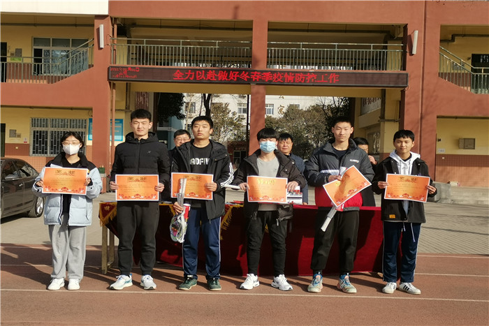 2021年2月1日,郑州市第三十六中学举行2020-2021学年冬季阳光体育活动拔河比赛颁奖仪式。政教处主任张少江宣读获奖名次及班级名单,校长李刚、副校长李有欣、副校长王国法共同为学生颁发奖状和奖品。