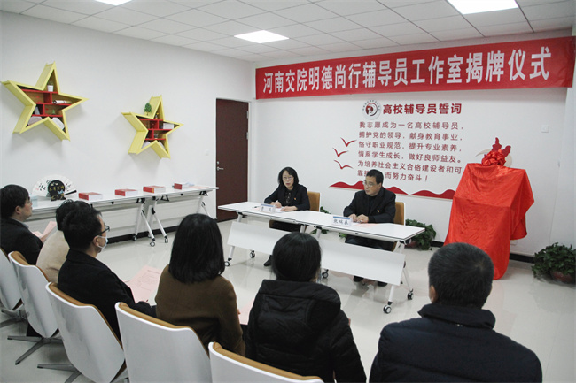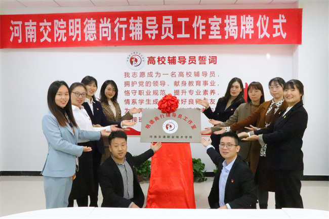 近日,河南交通职业技术学院(简称“河南交院”)“明德尚行辅导员工作室”揭牌仪式在郑东校区会堂举行。校党委书记曹焱出席仪式并致辞。党委宣传部、教务处、学生工作处、思想政治教学部负责人、各院(系)党总支书记、辅导员代表以及工作室全体成员参加揭牌仪式。揭牌仪式由副校长张瑞春主持。