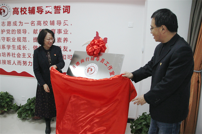 曹焱和张瑞春共同为“明德尚行辅导员工作室”揭牌,全体工作室成员及辅导员代表共同宣读高校辅导员誓词。