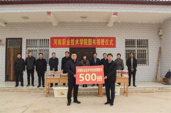 学校电商物流学院党总支负责人在屈楼村留守儿童图书馆施工现场,向该村转赠了由该院教师共同义捐的500册少儿图书。