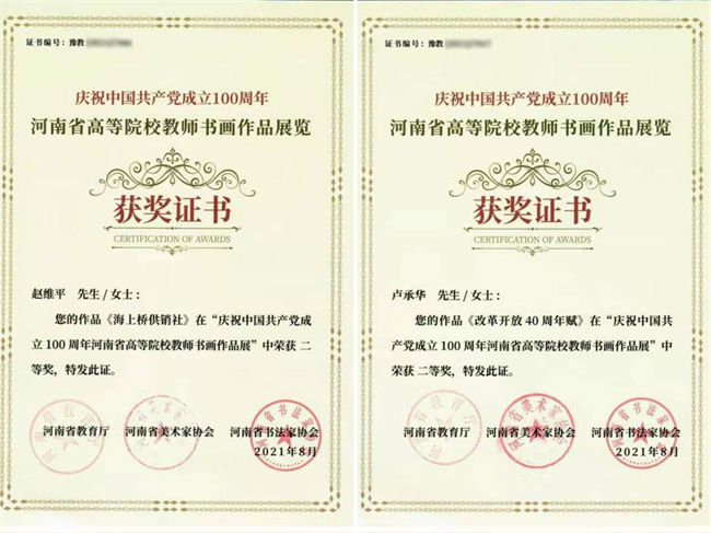 近日记者从升达经贸管理学院获悉,由河南省教育厅、河南省美术家协会、河南省书法家协会面向全省高校教师举办的“立德树人 百年筑梦——庆祝中国共产党成立100周年河南省高等院校教师书画作品展览”结果揭晓,校艺术学院赵维平教授、卢承华副教授的作品分别获得绘画和书法作品二等奖。
