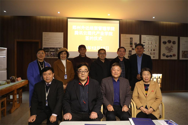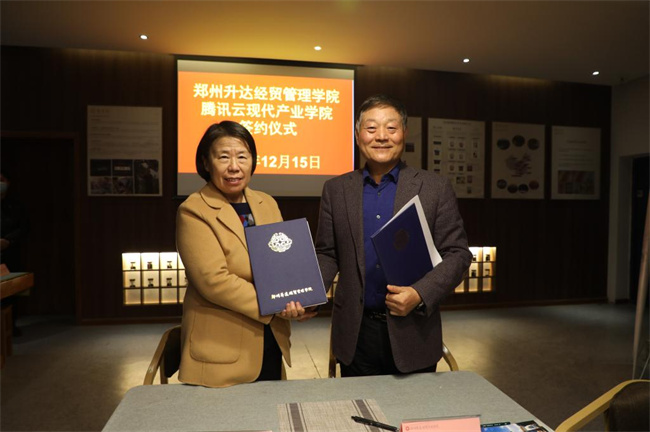 12月15日下午,升达经贸管理学院与腾讯、河南科诚数字科技有限公司共建腾讯云现代产业学院签约仪式在本相茶学院举行。河南科诚数字科技有限公司董事长陈哲、腾讯教育行业总监李杰,升达经贸管理学院执行董事王新奇、校长郭爱先、副校长吴益民以及相关院部主管参加签约仪式。仪式由吴益民主持。