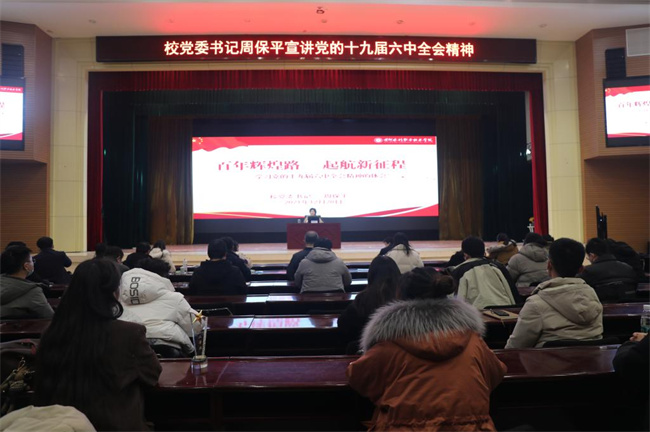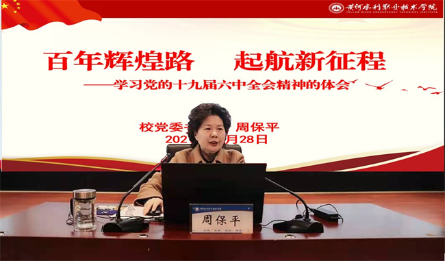 12月28日下午,黄河水利职业技术学院党委书记周保平以《百年辉煌路起航新征程——学习党的十九届六中全会精神的体会》为题,宣讲党的十九届六中全会精神。各学院党总支书记、机关党总支第一党支部、辅导员代表等聆听了宣讲。