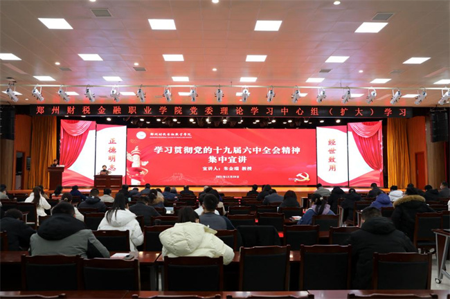 12月29日,省委宣讲团成员、河南财经政法大学副校长朱金瑞教授走进郑州财税金融职业学院,宣讲党的十九届六中全会精神。学院领导班子、全体中层干部、党支部(总支)委员、思政部教师及马克思主义理论研究协会学生代表等参加会议,集体学习聆听专家报告。党委书记王霄鹂主持会议。