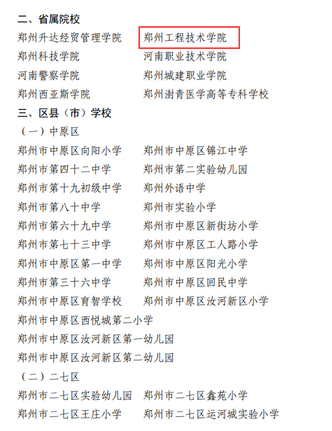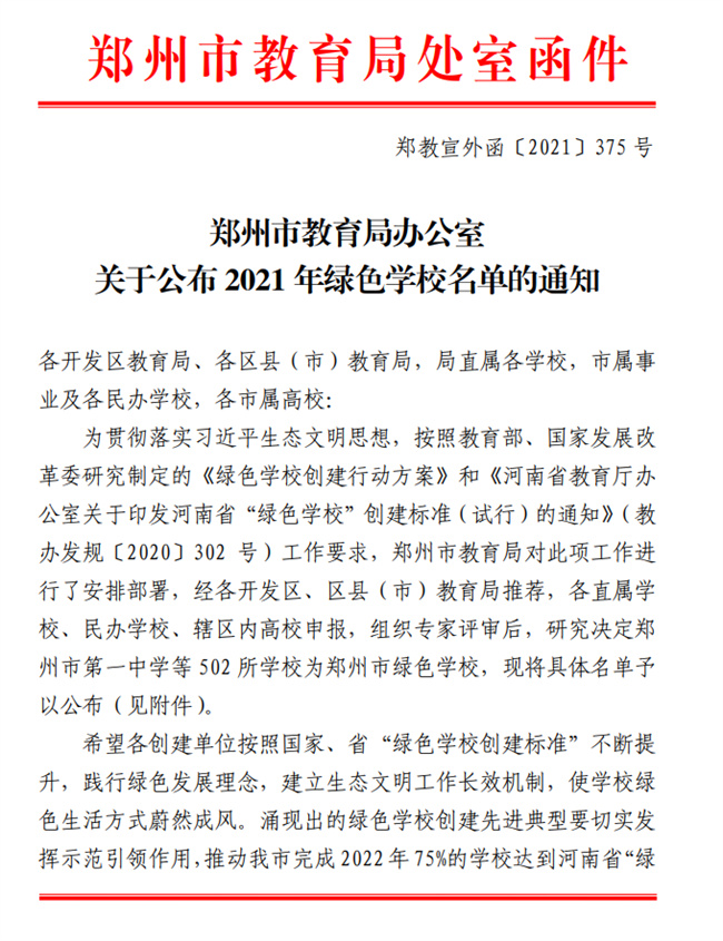 近日,郑州市教育局办公室发布《关于公布2021年绿色学校名单的通知》(郑教宣外函【2021】375号)文件,郑州工程技术学院荣获2021年“绿色学校”荣誉称号。
