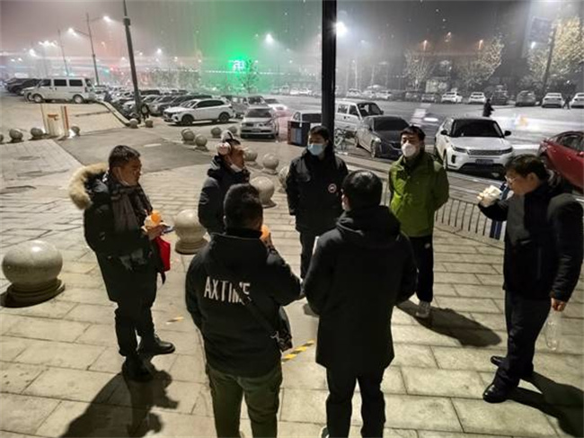 王霄鹂与来栋梁为志愿者们送来了面包、牛奶等慰问品,并询问了解核酸采样志愿服务工作的相关情况,对志愿者们在寒冬中的辛勤付出和无私坚守表示衷心的感谢。王书记谈到,今天是中国传统节日——腊八节,但是大疫当前,同志们舍小家、为大家,毅然挺身、逆行出征,充分彰显了郑财院人的使命担当,是广大教职工学习的楷模与榜样。王书记强调,当前疫情防控形势依然严峻,广大党员干部要坚决杜绝松懈麻痹思想,从严、从紧落实疫情防控的各项举措,要进一步发挥先锋模范带头作用,坚决打好、打赢这场疫情防控硬仗。最后,王书记还叮嘱大家一定要做好自身防护,做好保暖御寒工作,学院党委将作为大家的坚强后盾,全力以赴为大家做好后勤保障工作。