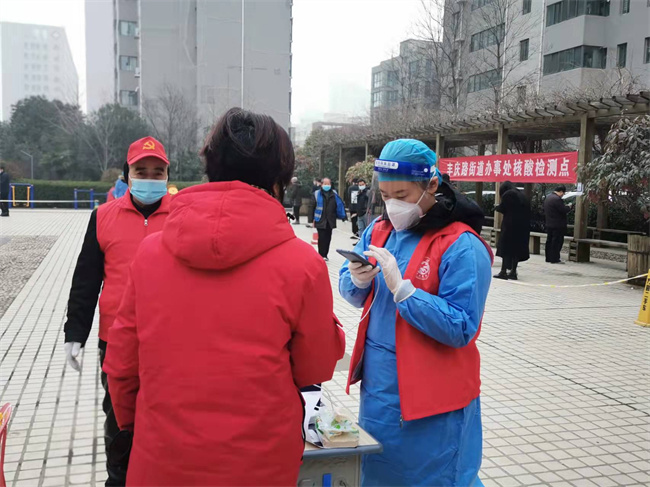 她的志愿服务工作,主要是协助社区的工作人员在丰庆路街道办事处玖号公寓社区核酸检测点进行信息登记和扫码工作。每天从早上8点就穿好防护服,做好个人防护措施,开始布置现场,进行现场消毒,每一个步骤都有严格的标准和要求。郑州的初雪降临,寒风瑟瑟,但核酸检测在严谨、有序的过程中进行,她和社区的工作人员一起认真负责地对每一位来进行核酸检测的人员进行扫码,并对老人、幼儿、学生等特殊人群开启绿色通道。每天的工作紧张且忙碌,一直坚守到下午4点。志愿者也要做完核酸检测,再次进行现场消毒,收拾打扫后,才结束一天的志愿服务工作。