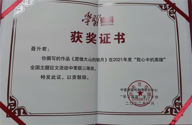 近日,“学习强国”学习平台举办的“我心中的英雄”主题征文活动获奖名单公布,濮阳职业技术学院体育健康学院2019级学生聂升君的作品《愿做大山的明月》获三等奖。