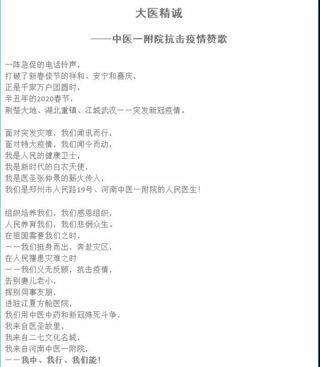 近日,多位艺术界友人有感于近年来一附院医务工作者为疫情防控工作做出的突出贡献,围绕一附院抗疫事迹,联合创作并录制了诗词朗诵作品——《大医精诚:中医一附院抗击疫情赞歌》,以表达对战疫一线最美逆行者们的致敬之情,该部作品于2022年1月23日,在“河南朗诵”公众号平台发布。