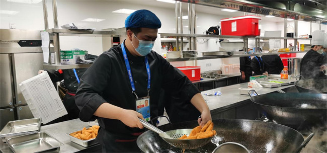 为保证技术官员和志愿者每天吃到可口的美味,糖醋里脊、红烧肉、鸡里蹦、炸鱼排、耗油扒菜胆、五彩素绘......一道道美食每天轮番登场,这些美食的背后离不开烹饪工艺与营养专业学生的辛苦付出。他们每天迎着晨曦出发,在后厨进行着紧张而有序的工作,披星戴月而归结束一天的奋战,为保证每天的花样美食付出着艰辛的劳动。