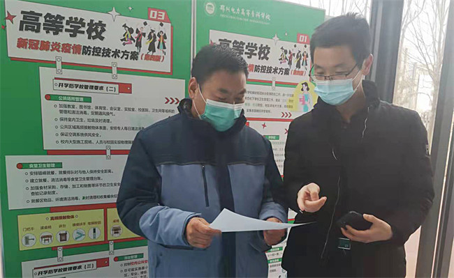 为全力保障春季返校开学工作安全有序开展,2月17日,郑东新区教育防控督导“五员专班”来到郑州电力高等专科学校,对该校返校开学准备工作进行检查,学校疫情防控有关负责同志陪同检查。