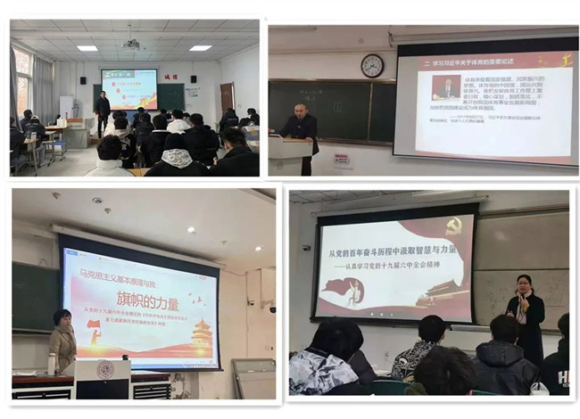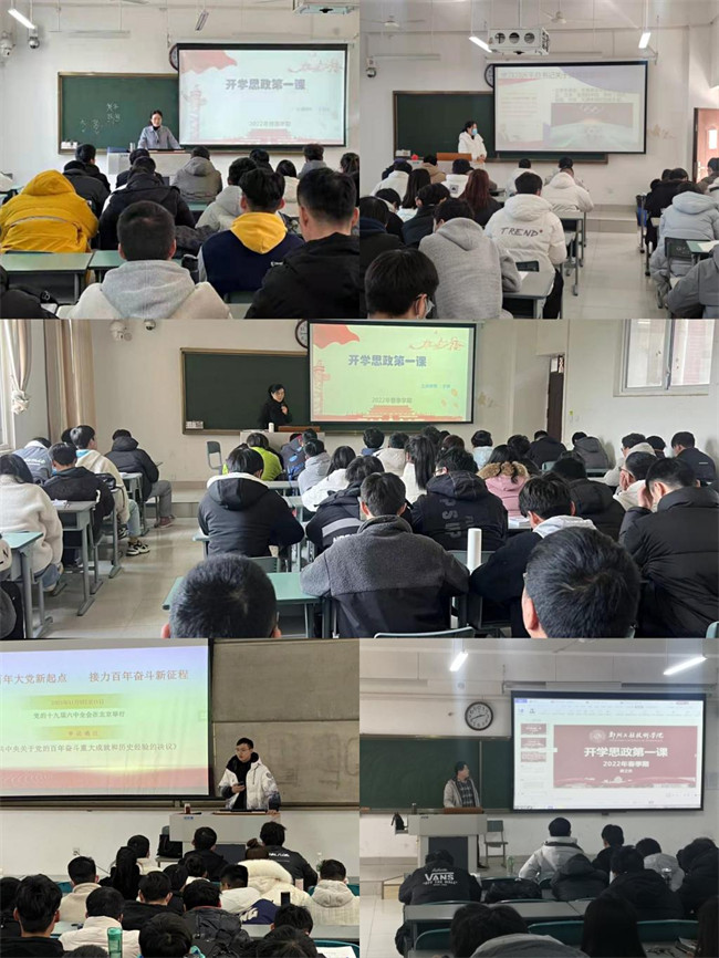 为全面落实《关于新时代加强和改进思想政治工作的意见》,根据中共河南省委教育工委、河南省教育厅以及郑州市和校党委的安排部署,郑州工程技术学院马克思主义学院于2月19日开始迅速行动并积极安排,以深入学习党的十九届六中全会精神、深入学习中国共产党河南省第十一次代表大会精神为核心内容,组织五个教研室进行集体备课、制作教学课件,结合不同的课程和专业角度进行解读,带领学生一起打造丰富的“思政盛宴”。目前,开学思政第一课仍在持续进行中。