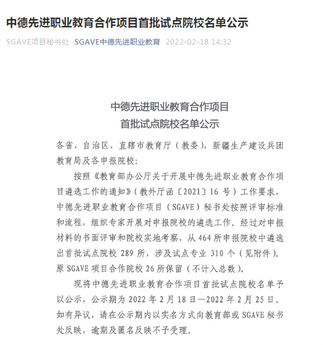 此次试点院校遴选工作,是在对申报材料的书面评审和实地考察的基础上、从参选的464所院校中遴选出289所,教育部国际合作与交流司、职业教育与成人教育司委托中德先进职业教育合作项目秘书处组织开展。旨在借鉴德国等欧洲国家行业龙头企业开展“双元制”人才培养的技术和经验储备,按照“双元制”模式要求中德联合开发和实施适应我国国情的技术技能人才培养方案。通过课程体系建设、“双师型”教师队伍培养、考核和评估认证体系构建等多种方式,推动“三教”改革,提升职业院校产教融合、校企合作与国际交流水平,打造高素质技术技能人才培养国际合作精品项目,为我国制造业转型升级和高质量发展奠定人才基础。