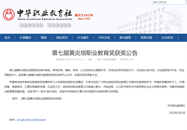 黄炎培职业教育奖是由中华职业教育社创立,经中共中央、国务院专项审核通过,是职业教育领域唯一保留的国家级奖项,代表了我国职业教育界的最高荣誉。该奖项自2007年创设以来,至今已成功举办七届,评选表彰了一批在弘扬黄炎培职教思想、推动我国职业教育事业发展方面做出贡献的优秀单位和杰出个人,得到国内职业教育界广泛认可。