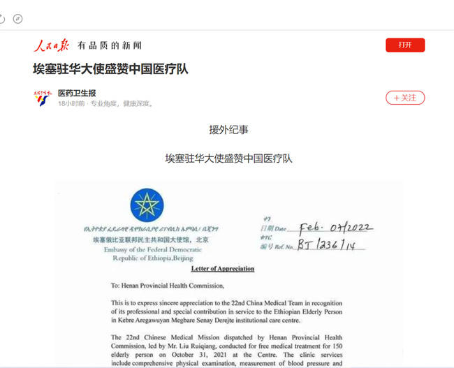 2月11日,人民日报人民号发布援外记事——埃塞驻华大使盛赞中国医疗队。受表扬的中国援埃塞俄比亚第22批医疗队16名队员中包括该校外语学院何阳教授和三附院林国平副主任医师2名优秀队员。