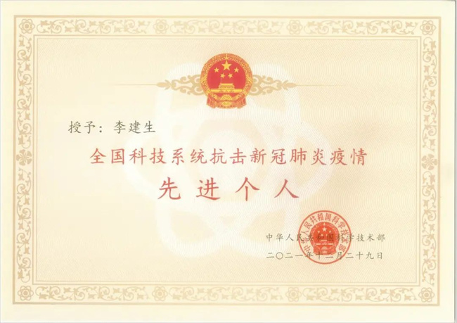 新冠肺炎疫情发生以来,以李建生教授为代表的学校广大科技工作者迎难而上,攻坚克难,为抗击疫情作出了突出贡献,以实际行动诠释了伟大抗疫精神和胸怀祖国、服务人民、勇攀高峰的科学家精神,李建生教授荣获“全国科技系统抗击新冠肺炎疫情先进个人”称号。