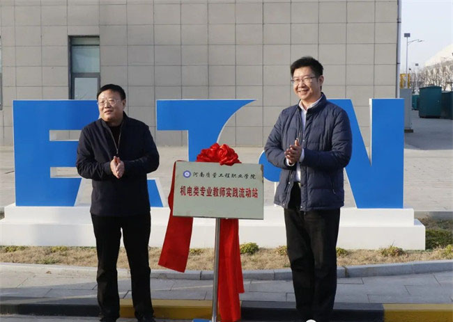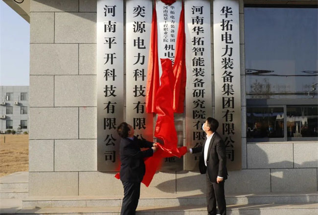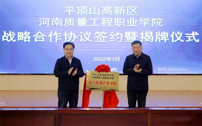 邱红标和凌兵奎共同为“平顶山高新技术产业开发区管理委员会、河南质量工程职业学院电气装备产业学院”揭牌;徐宗华和华拓电力装备集团有限公司总裁李宪鹏共同为“河南质量工程职业学院机电专业产教融合生产性实训基地”揭牌;田新现和伊顿平顶山工厂总经理高付民共同为“河南质量工程职业学院机电专业教师实践流动站”揭牌。