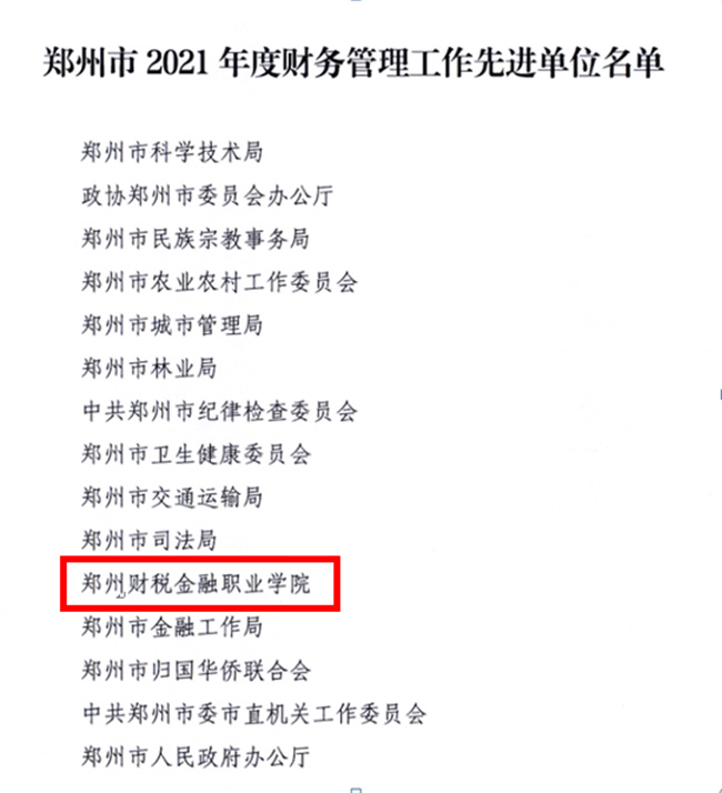 近日,郑州市财政局印发《关于2021年度财政管理工作先进单位及财务管理工作先进单位的通报》(郑财办﹝2022﹞12号),郑州财税金融职业学院荣获“郑州市2021年度财务管理工作先进单位”,是全市唯一一所获此殊荣的高校。