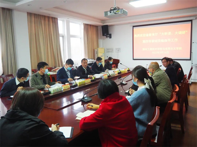 为全面提升大学生学习思政课的获得感和满意度,深入实施高校思政课教师能力提升攻坚计划,3月16日上午,省教育厅“大听课、大调研”第四专家组组长、郑州商学院党委书记马书臣一行6人莅临郑州工程技术学院指导调研工作。校党委委员、宣传部长吕村,教务处处长周晓莉,马克思主义学院负责人及部分教师参加调研活动。