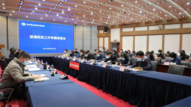 会上,疫情防控指挥部副指挥长、校党委副书记、副校长、工会主席张金安就认真贯彻落实党中央、国务院、省市各级疫情防控会议精神,从八个方面对学校疫情防控工作进行了具体安排部署:一是要召开两个专题会议。二是要严把学校大门关。要按照“五个一律”的要求做好门卫管理,非本校人员一律不准入校。严格执行入校身份核验、刷两码、测体温、信息登记、查验48小时内核酸检验证明等措施。严格落实快递、物流等消毒消杀,引导广大师生暂停网络购物、订购外卖等行为。三是要加强学生管理。原则上学生不允许请假外出,如因身体原因或特殊情况需要出校,要严格履行审批手续,严禁翻越围墙出入。四是要加强教职工管理。教职工原则上不允许离开校园和郑州,不乘坐公共交通,实行“两点一线”闭环管理,跨市流动需请假报批。本人及共同居住人员有离郑旅居史的,要主动进行报备,做到三天两检。省外返郑人员居家健康观察一周,一周内不聚集、不聚餐,并进行一周三检。五是要暂停校内聚集性活动,暂停外出培训交流,杜绝聚餐、聚会等活动。六是要做好日报告、零报告制度。各单位要做好晨、午、晚检和重点人群的行程轨迹及健康状况排查,加强对请假、校外居住等重点人员管理,强化重点场所、重点部位的消毒消杀。七是要加强人文关怀。做好心理健康教育,引导广大师生员工做自己健康管理的第一责任人。八是要完善组织架构。加强队伍力量,加大检查力度,对不遵守学校防疫规定,不配合落实相关管理措施等行为加大督导检查力度,对相关违规人员进行处理。