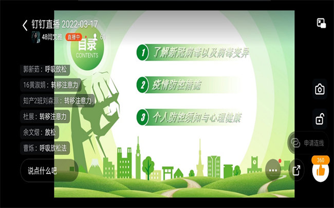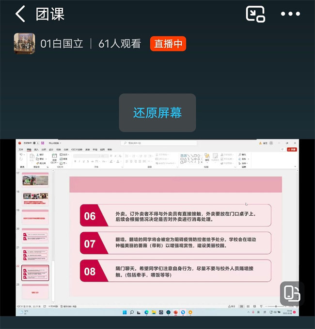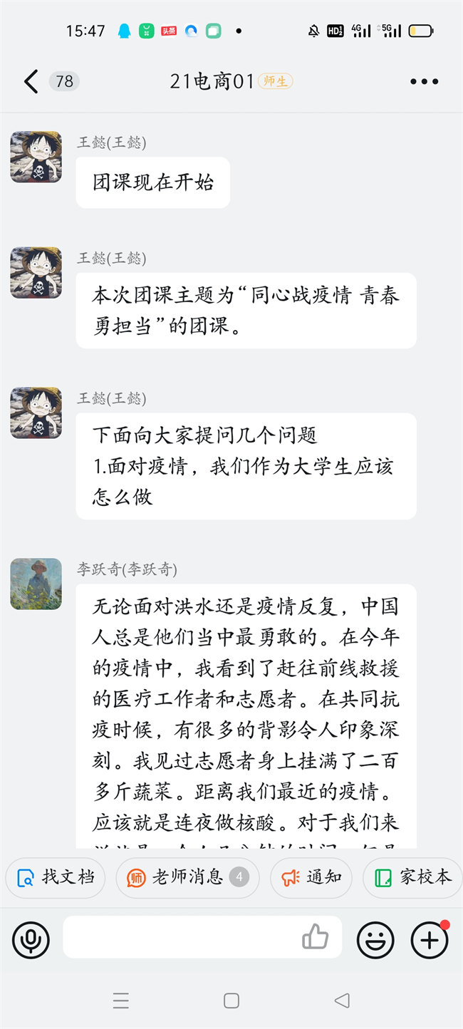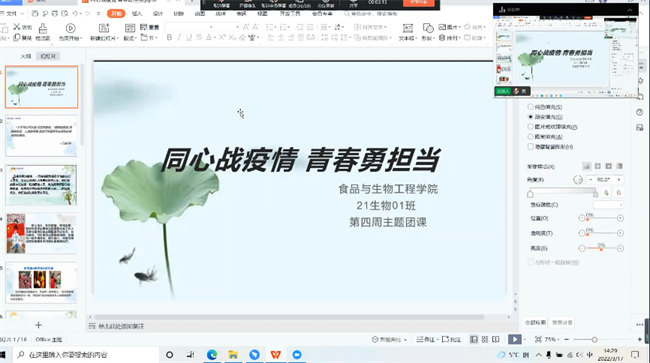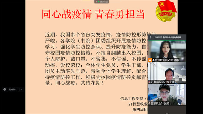 抗疫精神:经济与贸易学院、能源与智能工程学院利用团课宣传了在抗击疫情过程中所形成的伟大的抗疫精神,希望广大同学将抗疫精神内化于心,外化于行,在实践中践行,坚定战胜疫情的信心,凝聚披荆斩棘的力量共同战胜疫情。