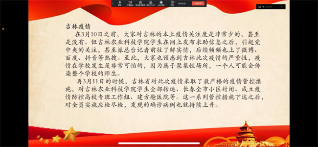 政策宣讲:动物科技学院、物流与电商学院通过展示我国目前疫情的最新情况及国家应对策略和学校采取的校园防疫措施,号召同学们积极应对疫情,做到不慌乱、遵纪律、懂担当,为学校、国家的抗疫事业献出自己的一份力量。