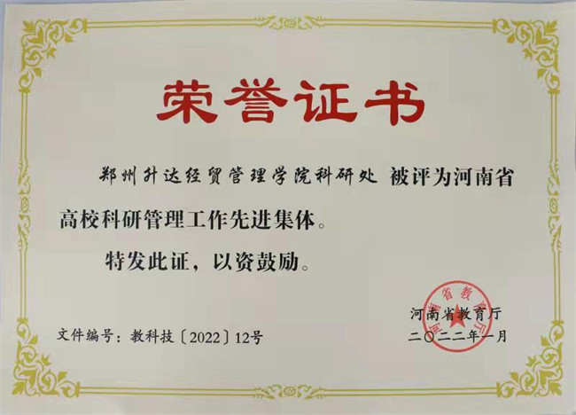 “十三五”以来,学校先后获得“河南省高校实施哲学社会科学繁荣计划先进单位”(全省28所获奖高校之一)“高校科研管理工作先进集体”“河南省社科普及先进单位”“河南省社科联优秀调研单位”(连续8年获得)“郑州市社会科学工作先进单位”“全省民办学校十佳校刊”“全国民办高校优秀学报一等奖”等荣誉;据《武书连2018中国民办大学教师创新能力排行榜》,升达经贸管理学院以A等级位居全国117所民办大学的第10位,河南省第2位。(陈军)