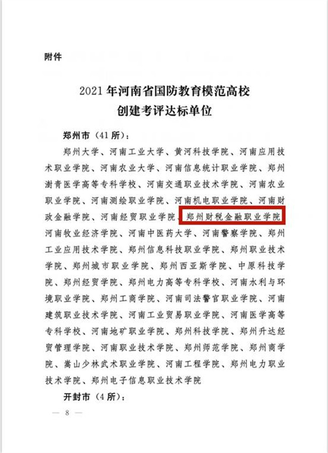 日前,中共河南省委宣传部、河南省教育厅、河南省军区政治工作局联合下发《关于2021年度国防教育模范高校创建活动考评情况的通报》(豫军政〔2022〕52号)。根据创建评定办法,郑州财税金融职业学院经高校自评、辖区人武部初评、省辖市测评和省评委员会集中审核,该院被评为“2021年河南省国防教育模范高校创建考评达标单位”。