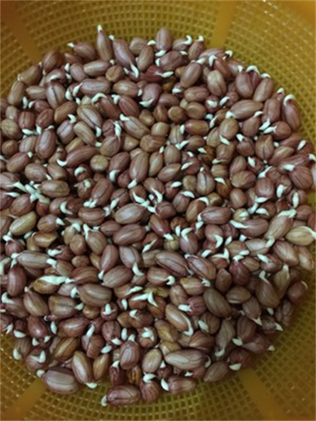 (1)浸种与催芽:将选好的花生用清水浸泡半天至一天。把浸胀清洗后的花生直接装入布袋,也可以放在底部有排水孔的盆内遮阳催芽,,根据气候条件,每天淋水2~3次,2~3天出白芽可以播种了。