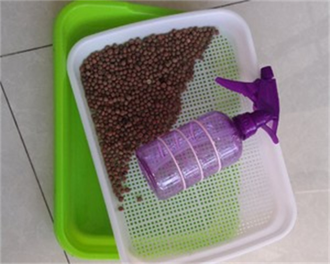 (2)24小时之后,把豆种捞出放在上层育苗盘里,用纸巾盖住,一般家里的抽纸,卷纸都行,把盘放在阴凉处,不能晒太阳,用喷壶每天朝纸上喷水3-5次,把纸巾喷潮即可,不用太多!下层育苗盘里不能放水!一般两天左右,你就会发现长出类似白色的根!不用管它,继续喷两天!