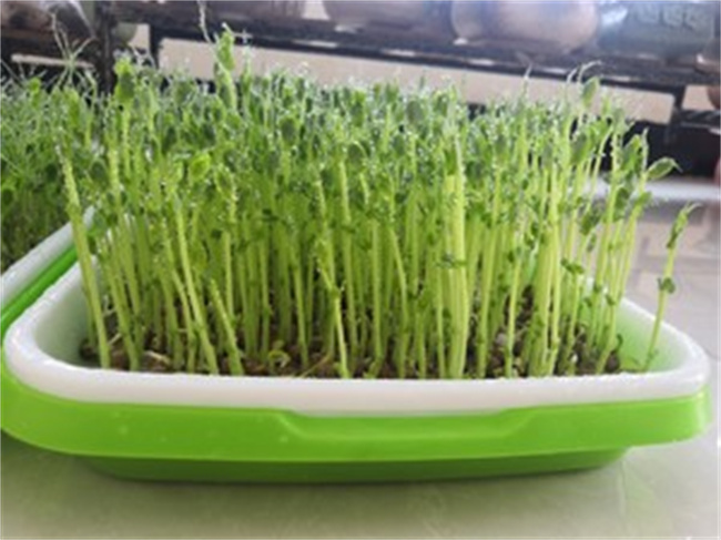 (5)豆尖不适宜养太高,不然会倒边,养到适宜的高度,用剪刀剪下来做菜,剪的时候不要剪太短,留个小芽口,这样才会发二茬,然后继续换水浇水,一般我们可以收割三茬豌豆苗!