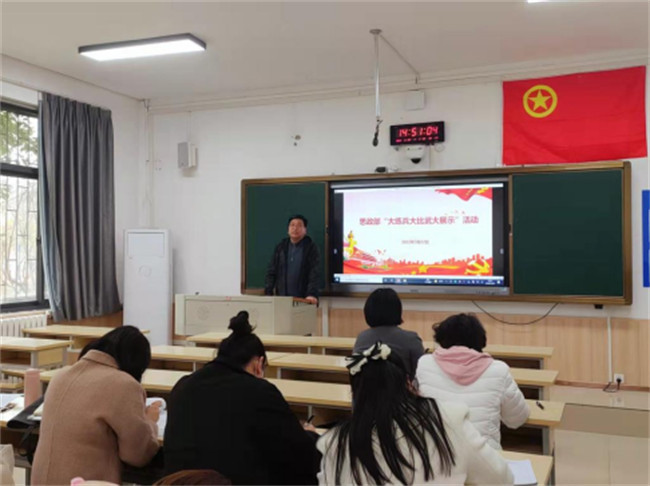 一是“大练兵”前思想动员。3月8日,孔继海主任在部门工作会议上传达了《关于开展全省学校思想政治理论课教学技能“大练兵、大比武、大展示”活动的实施意见》文件精神,动员部门教师全力参与,各教研室要开展集体备课,厉兵秣马,通过“大练兵”活动的展示、交流、学习,推动思政课教师教学技能与综合素质提升,全面推动思政课建设高质量发展。