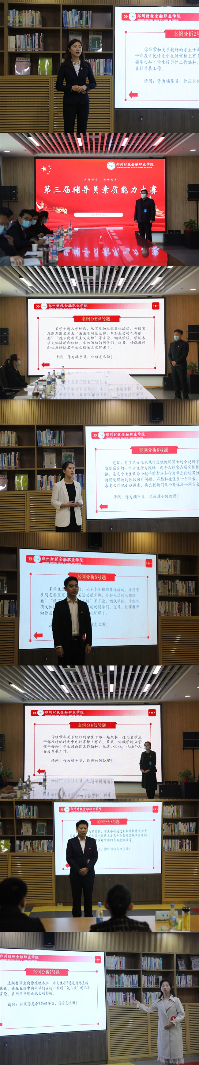 本次大赛按照教育部办公厅《关于举办第九届全国辅导员素质能力大赛的通知》中的赛制安排,分为基础知识测试、案例研讨、谈心谈话三个环节。基础知识测试于4月15日下午在厚德楼二楼会议室采用闭卷作答方式开展,重点考察辅导员的理论素养和业务知识;案例研讨于4月16日上午在图书馆分为A、B考场进行,主要考察辅导员综合运用理论分析问题、研判问题、解决问题、应急处理等能力;经过以上两项比赛的选拔,共有11名辅导员入围决赛。