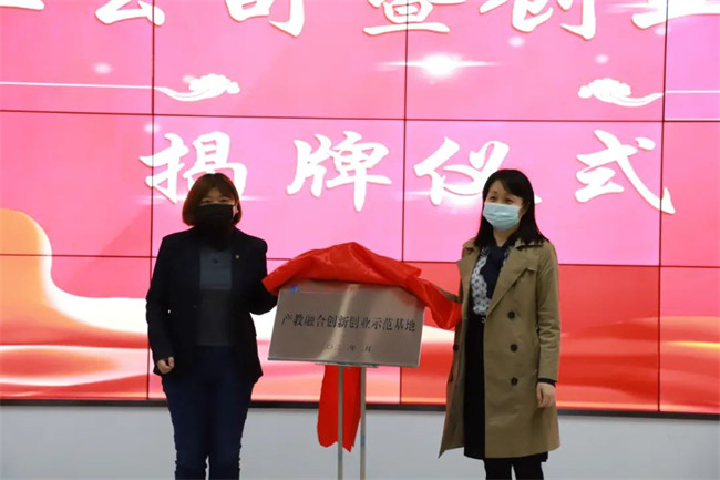 紧接着,党委书记张震和大数据学院执行院长张粤磊为河南线场教育信息咨询有限公司揭牌;校长王本亮和熊威总经理为数据产业服务基地揭牌;副校长谷献晖和大数据学院教学副院长马妮娜为产教融合创新创业示范基地揭牌。