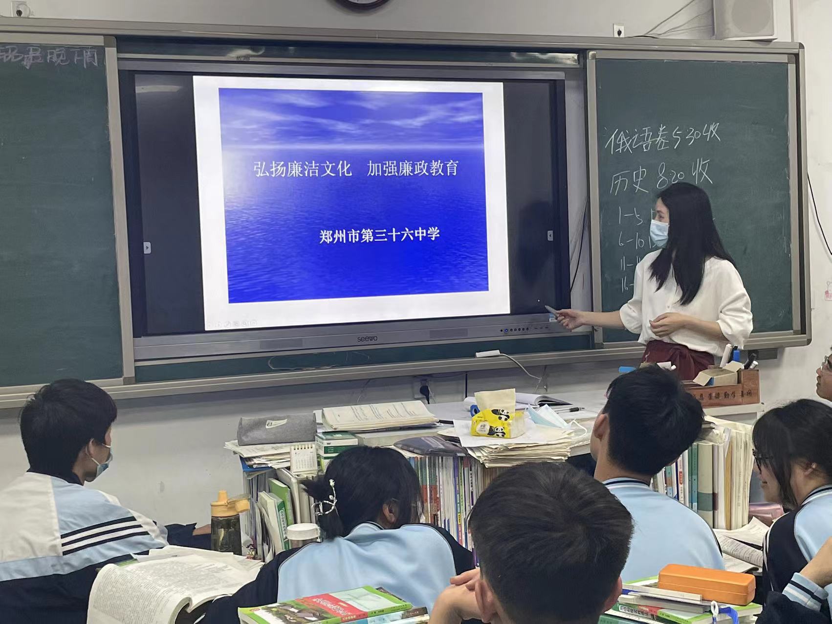 为增强广大师生崇廉拒腐意识,倡导清廉校风教风,营造浓厚的校园文化氛围,202年4月10晚,郑州市第三十六中学各班学生在学校政教处和各班班主任的精心安排和组织下,举行了“廉洁文化进校园”之“弘扬廉洁文化 加强廉政教育”主题班会活动。
