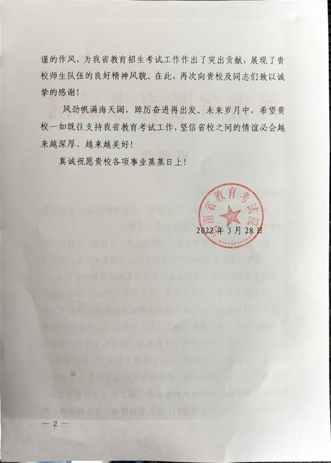 信中写到,自新冠肺炎病毒疫情以来,我省教育考试工作遇到前所未有的挑战和困难,贵校始终与省教育考试院队伍心手相牵、共克时艰。近三年来我省艺术和体育专业考试招生工作面临改革的任务,每每关键时刻,学校勇于担当、顾全大局,毫不犹豫选派优秀骨干力量给予充分的助力和支持,协助教育考试院攻坚克难圆满完成工作。