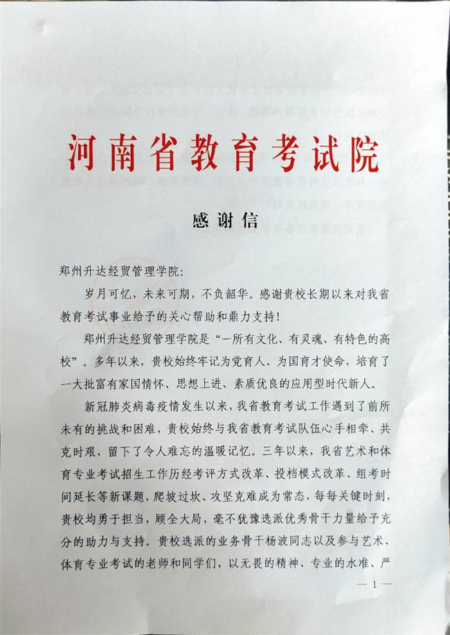 近日,郑州升达经贸管理学院收到河南省教育考试院的感谢信。在信中省教育考试院对学校长期以来对河南省教育考试事业给予的帮助和支持表示感谢,同时也祝愿学校各项事业蒸蒸日上。