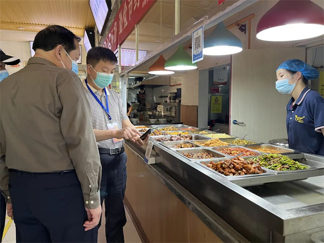 督导组一行对线上教学安排、人员管控、重点场所管理、后勤保障等防疫措施的落实情况进行了实地查看。随后一行人到学校大门、教学监控室、餐厅等与学生学习生活密切相关的场所,详细了解了教学管理、校园消杀、食品供应、物价监管等情况,并对餐厅工作人员的核酸检测情况进行了抽查检验。
